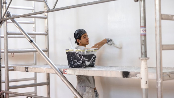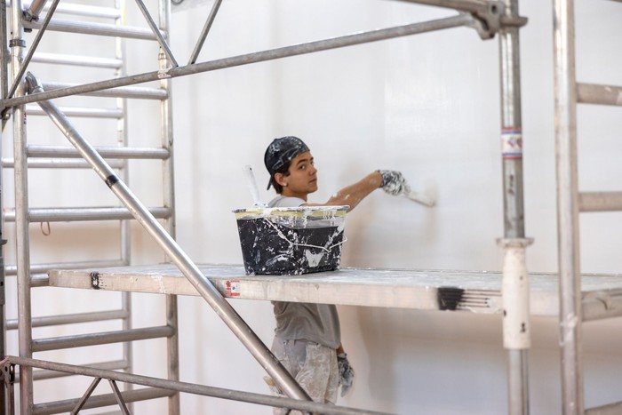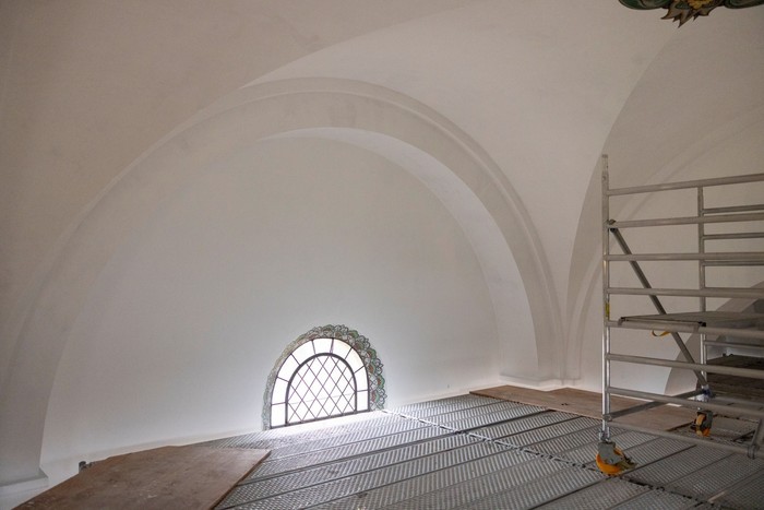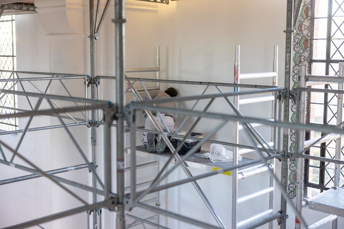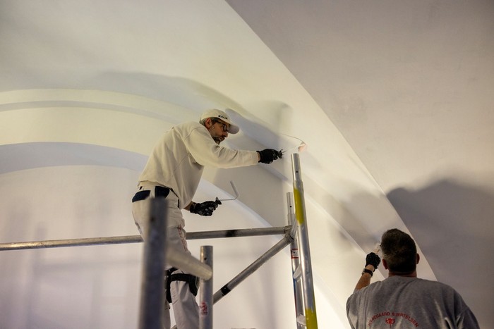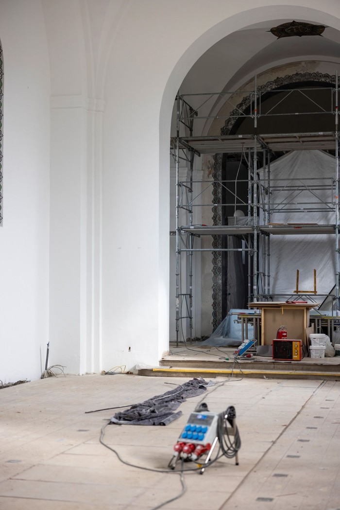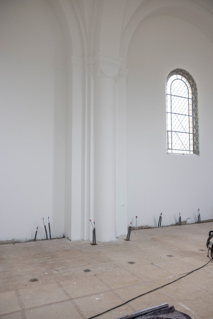 Revnerne i kirken er nu blevet udbedret, og væggene er malet to gange i en smuk, hvid farve, som giver rummet et lyst og indbydende udtryk. Det store stillads er blevet fjernet, og i stedet er der opsat mindre stilladser, som malerne bruger i det videre arbejde med at male friser og borter omkring alteret.