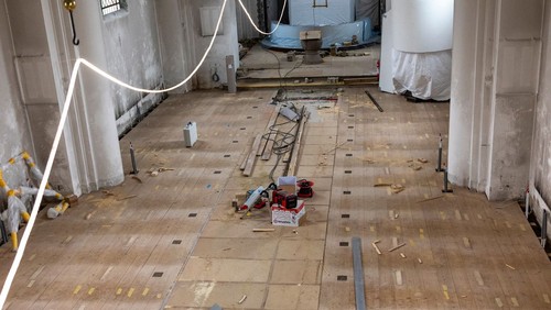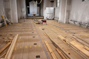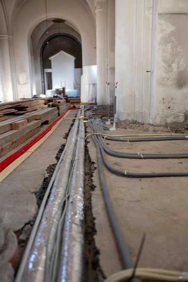 Det gamle gulv er midlertidigt blevet genlagt, da der skal opstilles stillads i kirken for at kunne vaske vægge og lofter ned. For at sikre et stabilt underlag er gulvet derfor lagt igen. I løbet af de næste par uger vil stilladset blive sat op, og derefter kan den tidskrævende og omhyggelige proces med at fjerne den gamle kalk begynde.