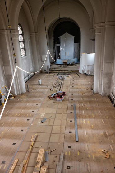 Når I kigger op på kirken, kan det måske ligne, at der er ved at blive pyntet op til jul med lyskæder indendørs. Det er dog ikke tilfældet – der er blot sat LED-arbejdslamper op, nu hvor vi er gået ind i den mørkere del af året.