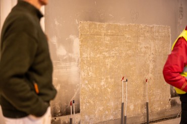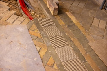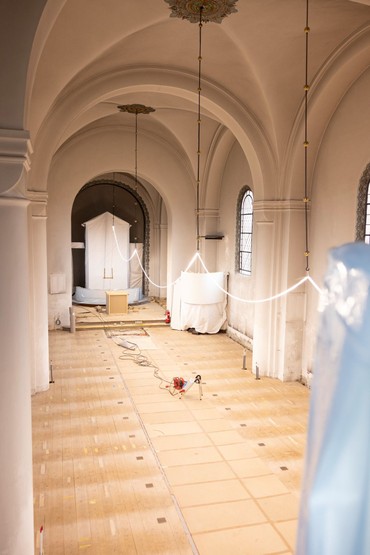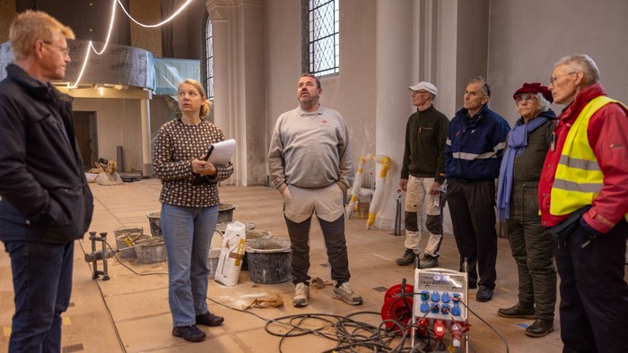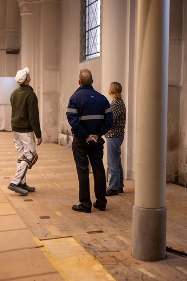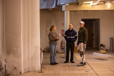 Murerne er desuden i gang med det tidskrævende arbejde med at lægge de fliser og klinker tilbage, som tidligere blev taget op for at trække el- og varmerør. I december kommer en konservator for at rengøre og sikre de malede friser og loftsudsmykninger.